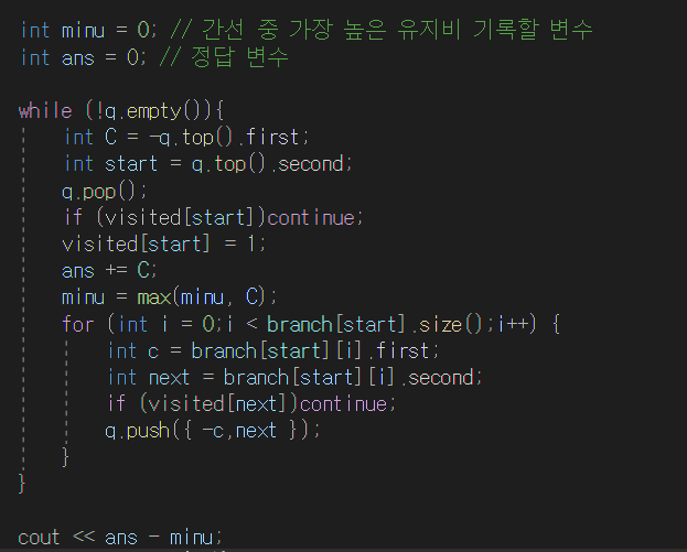 그 과정에서 나오는 유지비를 모두 ans 변수에 더하고 유지비 중 가장 큰 값을 minu 변수에 담는다.
