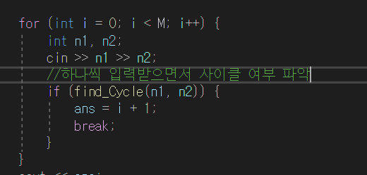 2. find_Cycle 함수에서 각 점의 루트 노드 값을 구해주고, 그 값을 기반으로 사이클이 돌고 있는지 확인해준다.