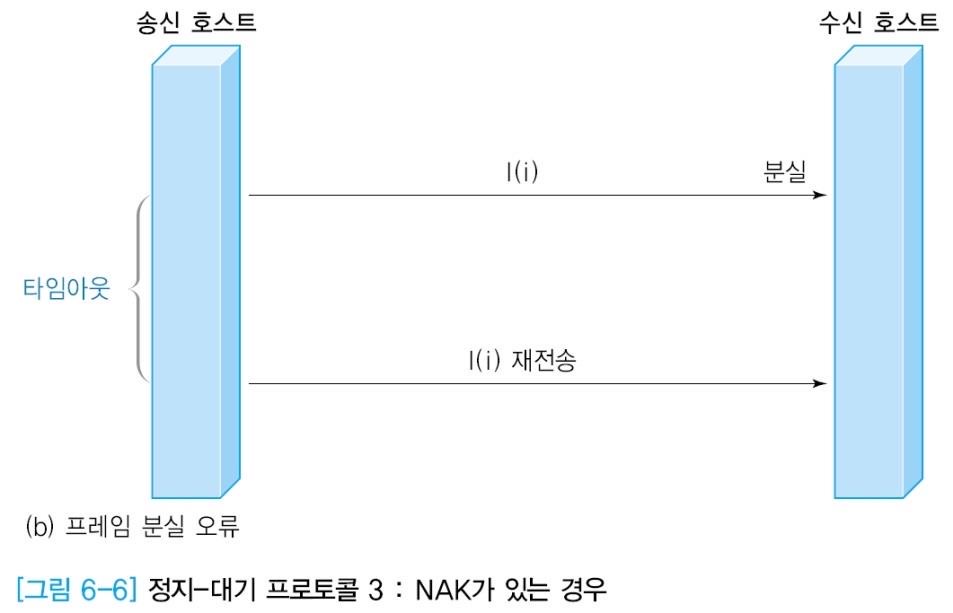 정보 변형이 일어났지만, 수신 호스트는 순서번호에 맞는 프레임을 받았고 긍정 응답밖에 할 수 없기 때문에 문제가 발생한다. => 타임 아웃 + NAK 을 줘보자.