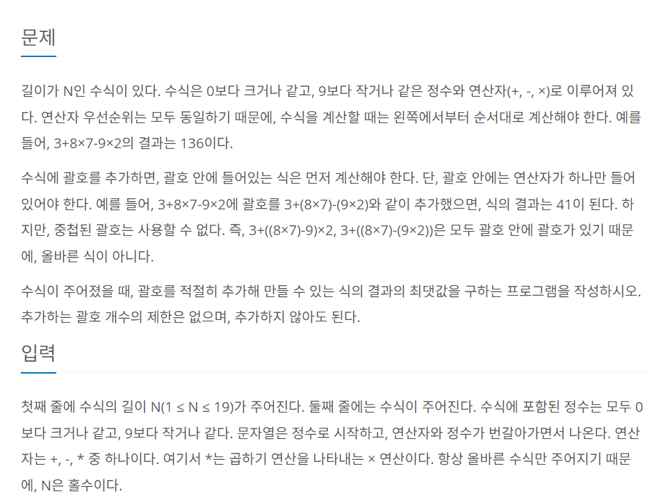 첫째 줄에 수식의 길이 N(1 ≤ N ≤ 19)가 주어진다. 둘째 줄에는 수식이 주어진다. 수식에 포함된 정수는 모두 0보다 크거나 같고, 9보다 작거나 같다. 문자열은 정수로 시작하고, 연산자와 정수가