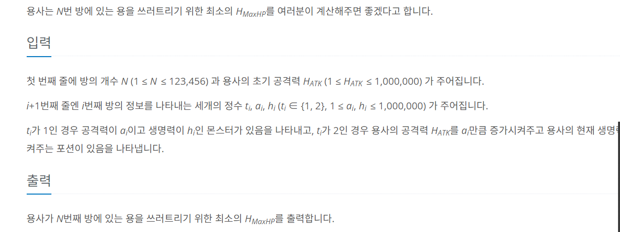 첫 번째 줄에 방의 개수 N (1 ≤ N ≤ 123,456) 과 용사의 초기 공격력 HATK (1 ≤ HATK ≤ 1,000,000) 가 주어집니다. i+1번째 줄엔 i번째 방의 정보를 나타내는 세개의 정수 ti, ai, hi (ti ∈ {1, 2}, 1